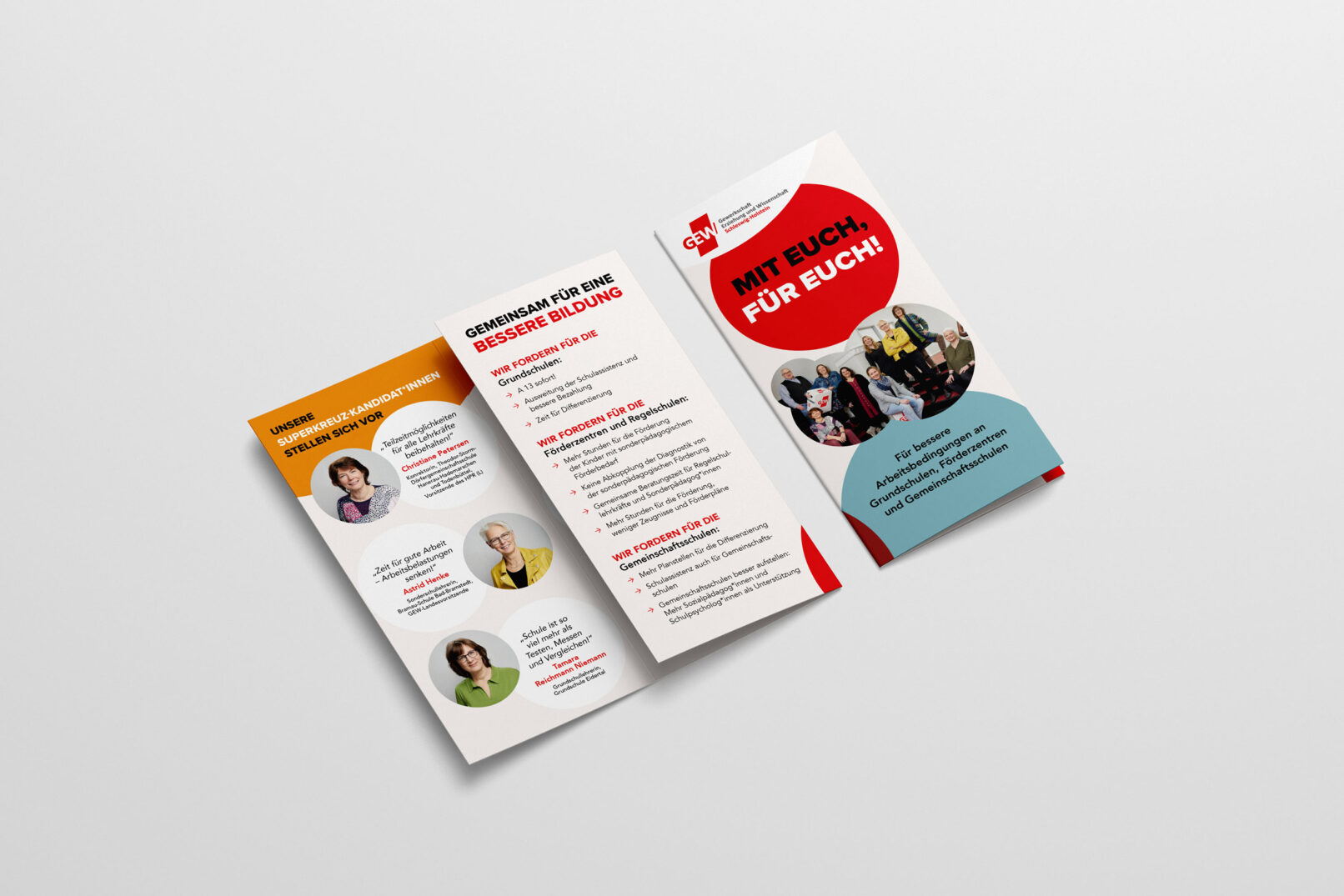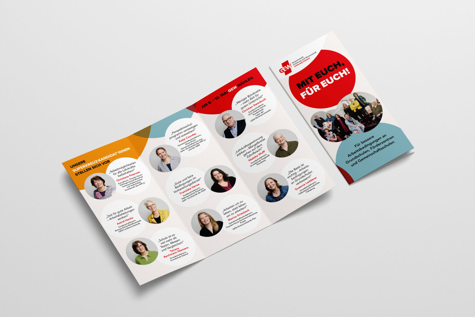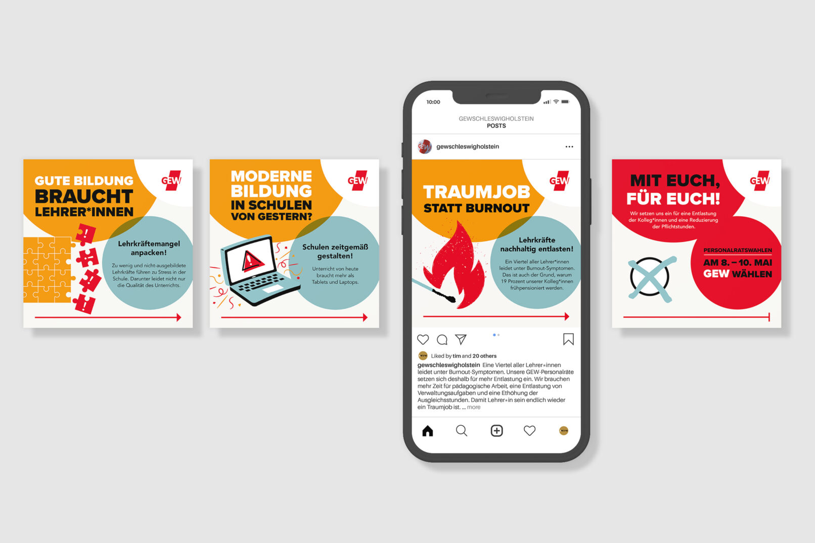 Mit der Kampagne „Mit euch, für euch!“ setzen wir die GEW als die Interessenvertretung der Lehrer:innen in Szene, die diese Herausforderungen und Handlungsfelder im Blick hat und mit Kompetenz und Tatendrang anpackt. Die Kampagne spricht Probleme und Missstände deutlich an, ohne dabei negative Assoziationen zur GEW und ihren Kandidat:innen zu erzeugen. Dies geschieht durch eine inhaltliche Trennung von Themen und Kandidat:innen. Mit Themenplakaten, die Problemfelder deutlich ansprechen, erzeugen wir Aufmerksamkeit und Bewusstsein. Auf den Plakaten mit den jeweiligen Kandidat:innen präsentieren wir hingegen eine positive Perspektive.